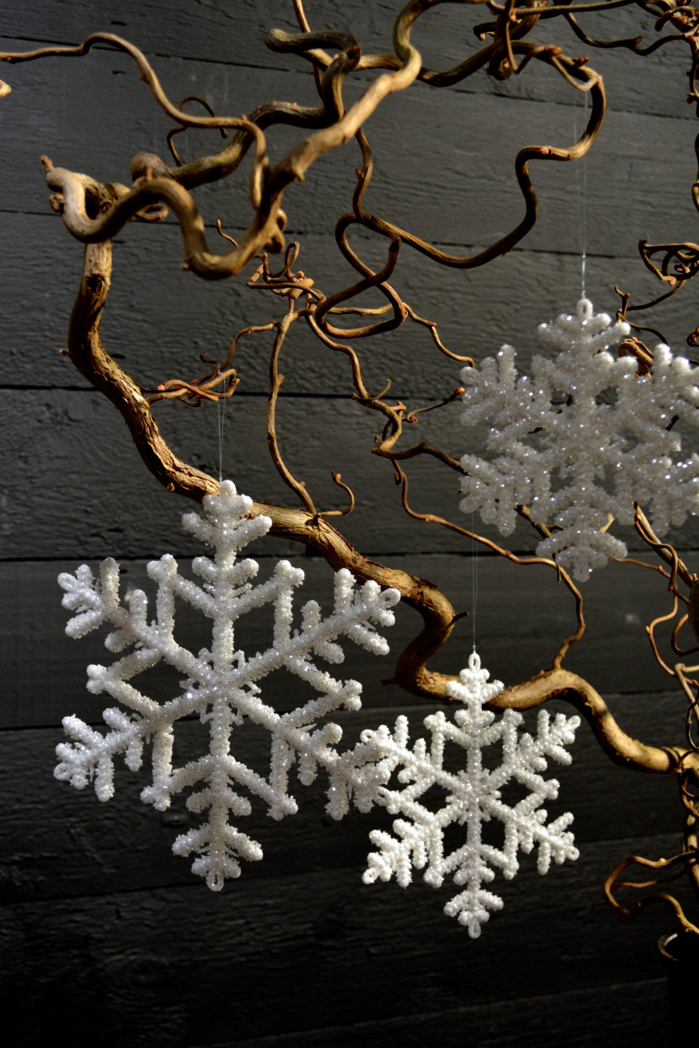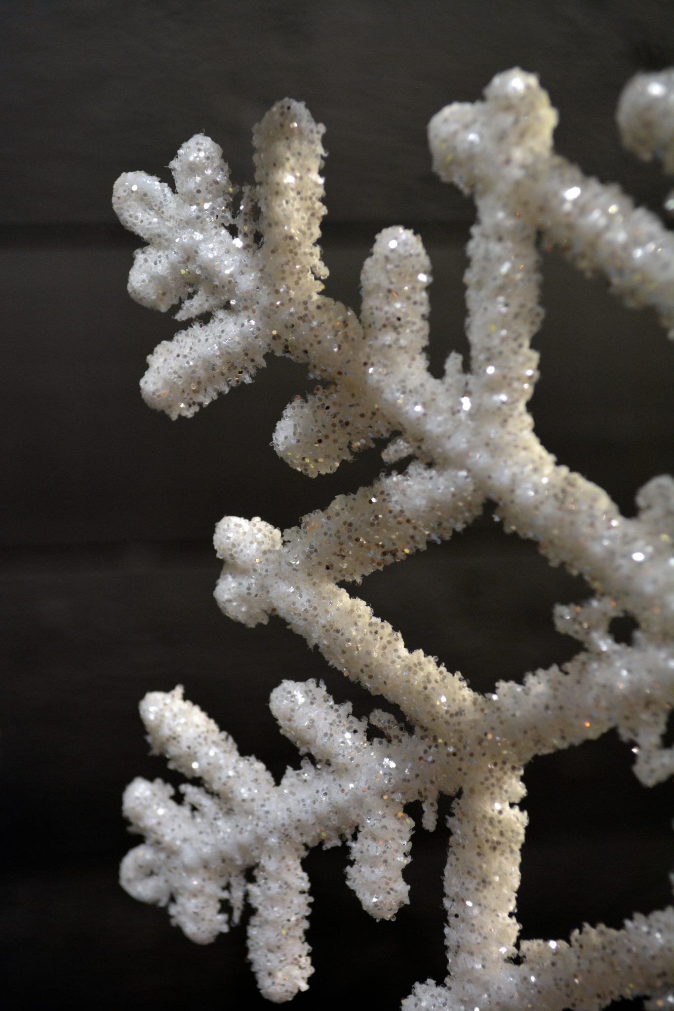 Dekorativt snøfnugg, hvit og sølv med glitter.