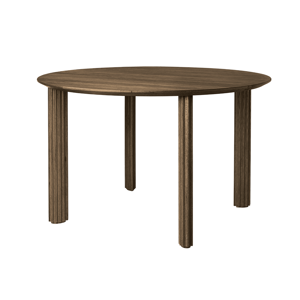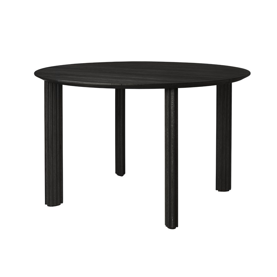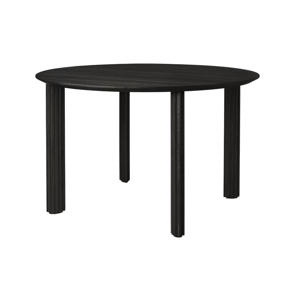 Tilgjengelig i eik, mørk eik og svart eik med en diameter på 120 cm, perfekt for fire personer.
