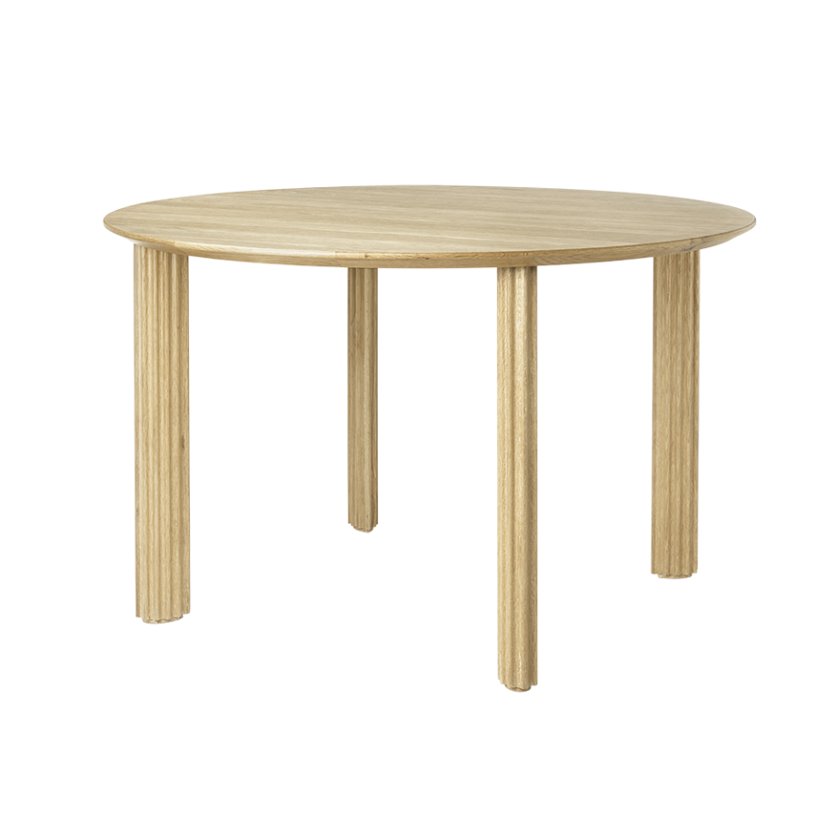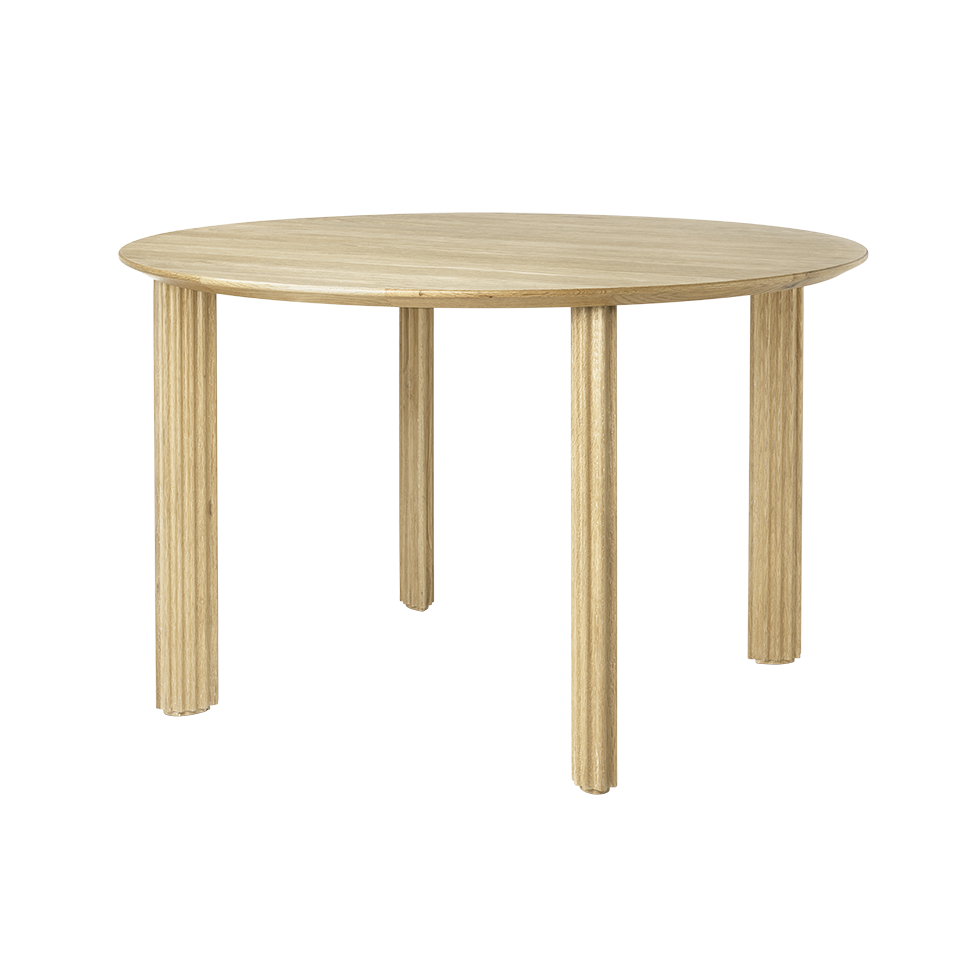 Det runde spisebordet har massiv eikeben og en bordplate i eikefiner. Det tilbyr en subtil lyshet i rommet, noe som gjør det perfekt for mindre rom og inviterer til den intime samtalen med alle sentrert mot midten.