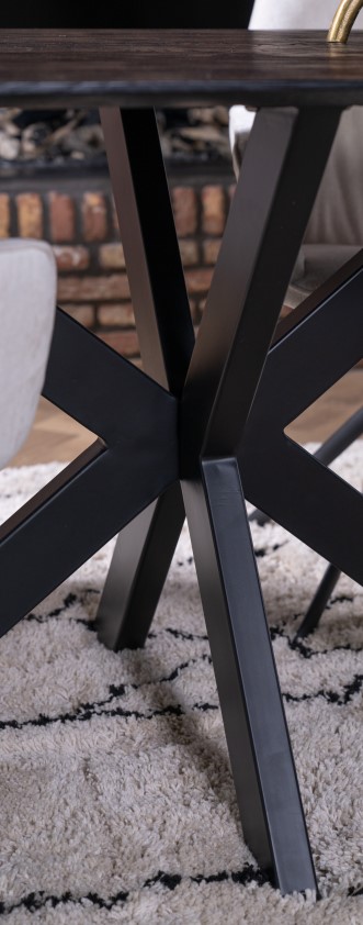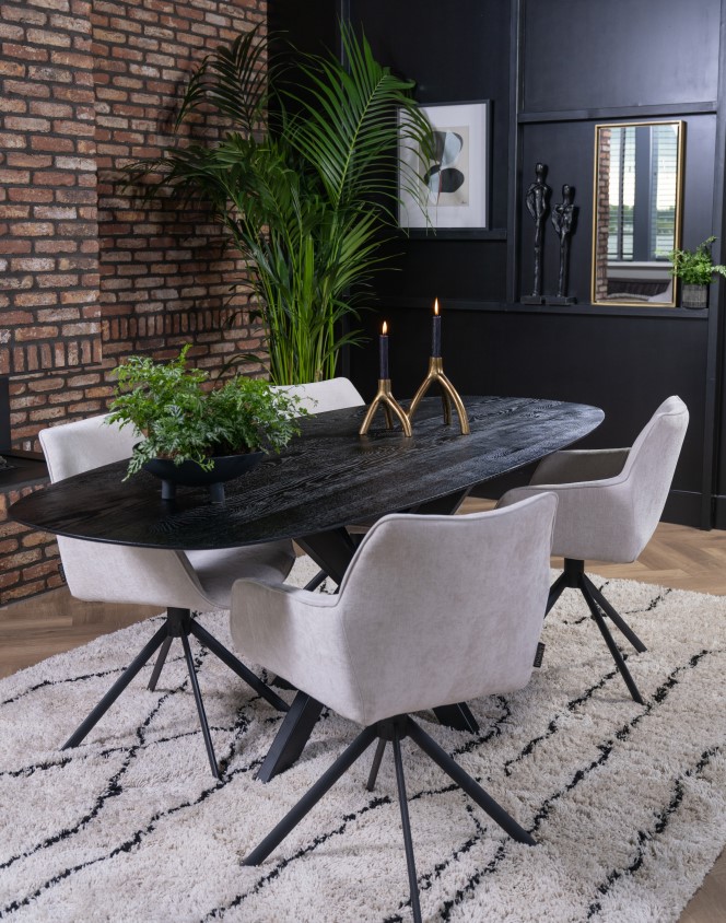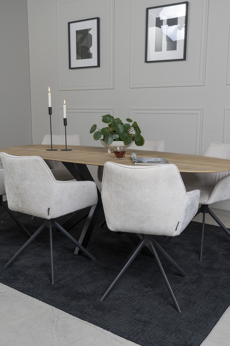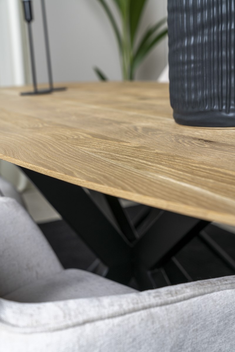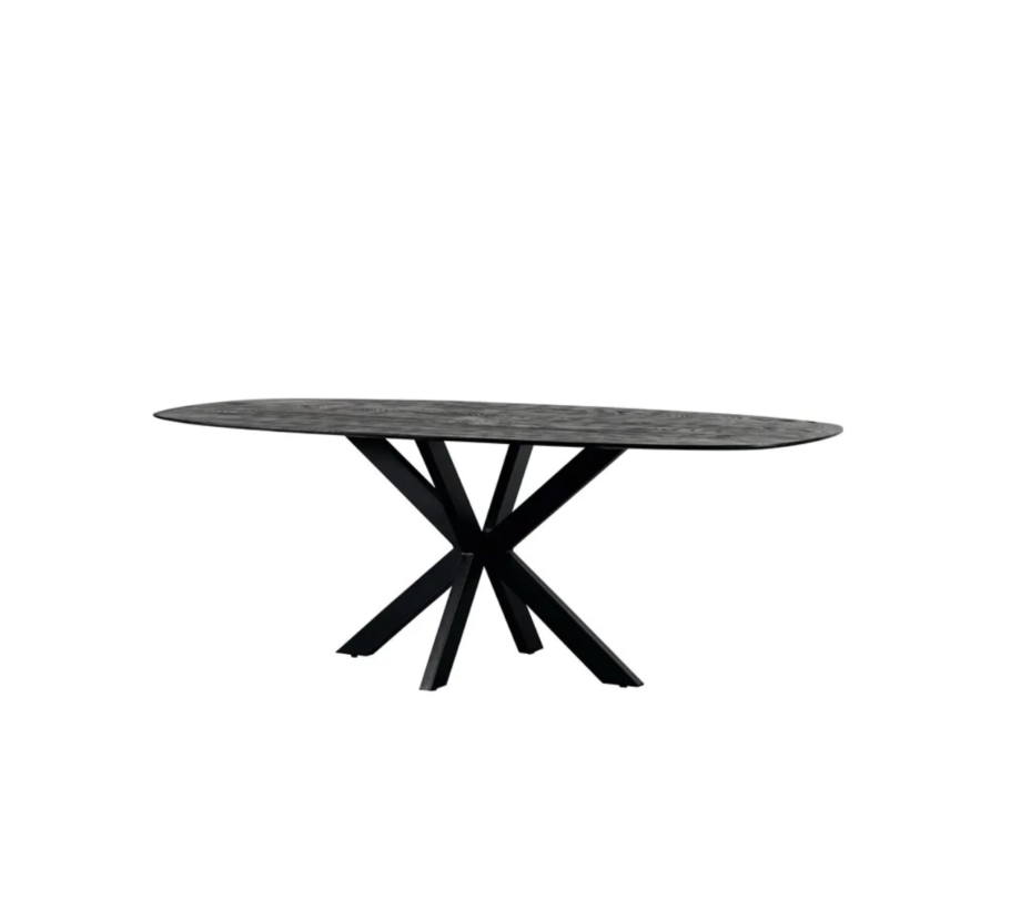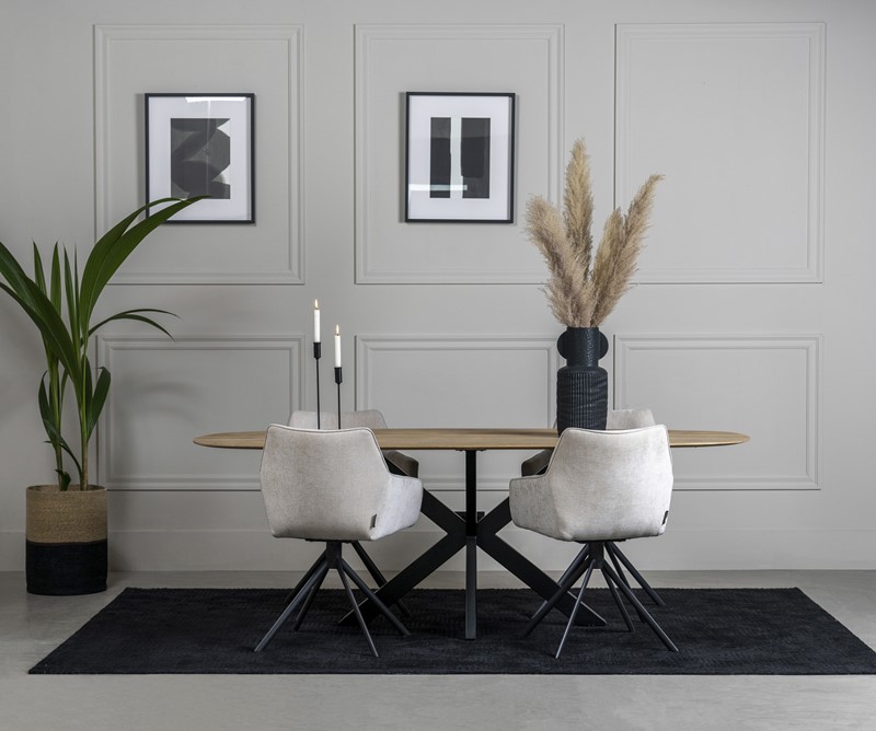 Spisebordet Kinsley fra det nederlandske merket Lifestyle, er laget med en oval heltre, børstet og grov eikeplate med struktur. Fin material miks med understell i kryss i lakkert metall.