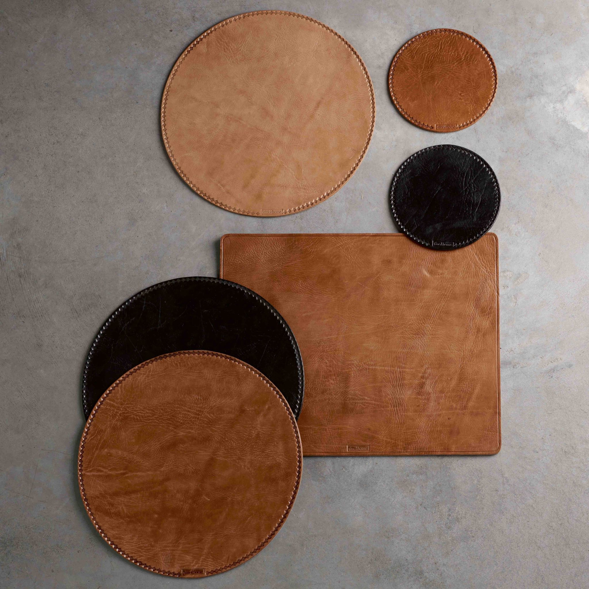 Spisebrikke i sort skinn. Håndlaget og gir et røft uttrykk til borddekkingen og blir bare kulere med tiden. Perfekt også på kontoret!