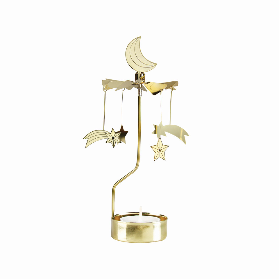 Stars go round, dekorativ telysholder i forgyllet metall. Varmen fra telysene gjør at stjernene roterer rundt i ring.