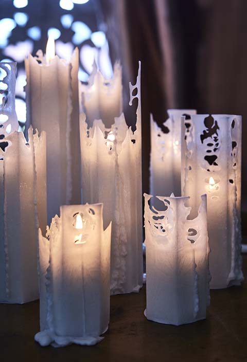 Dekorativt stearinlys som lager spider/blonde kant når det brenner.