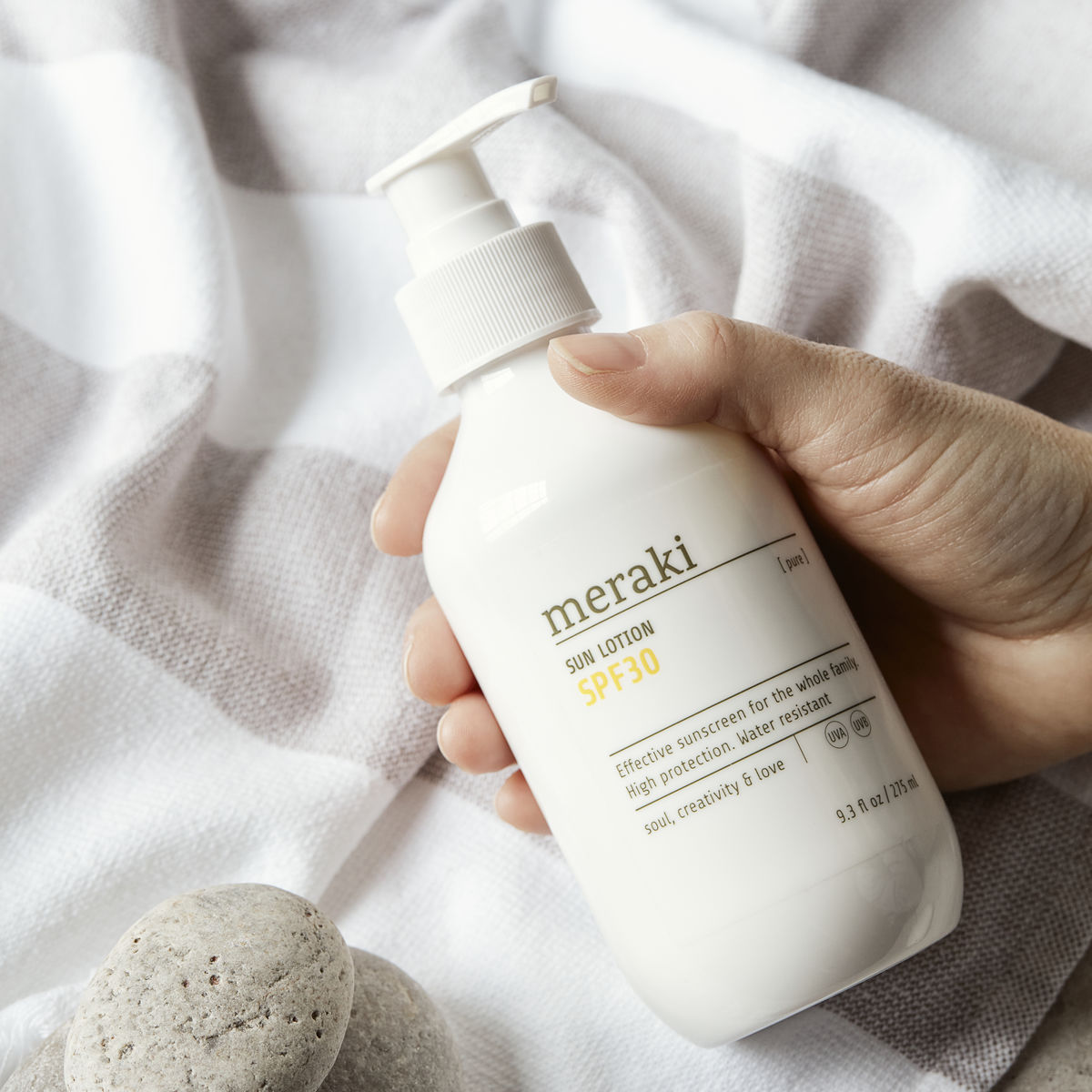 Beskytt huden din og gi den næring mens du er ute i solen med denne PURE Sun Lotion fra Meraki. Siden den er parfymefri og med SPF 30, er den egnet for både voksne og barn. Kjemiske UVA- og UVB-filtre absorberer solens skadelige stråler, og etterlater verken hvite striper eller en fet følelse på huden. For å holde huden myk og smidig, inneholder denne lotionen også vitamin E, en antioksidant som også beskytter mot frie radikaler. Uansett om du blir på strandteppet ditt eller hopper ut i vannet, så er du godt beskyttet med denne vannavvisende solkremen Svanemerket og anbefalt av Asthma-Allergy Nordic. Passer for veganere.