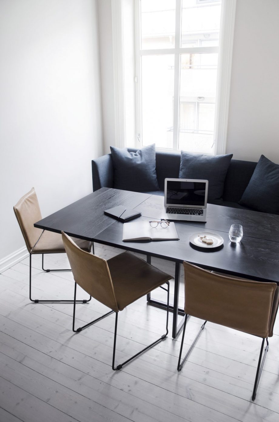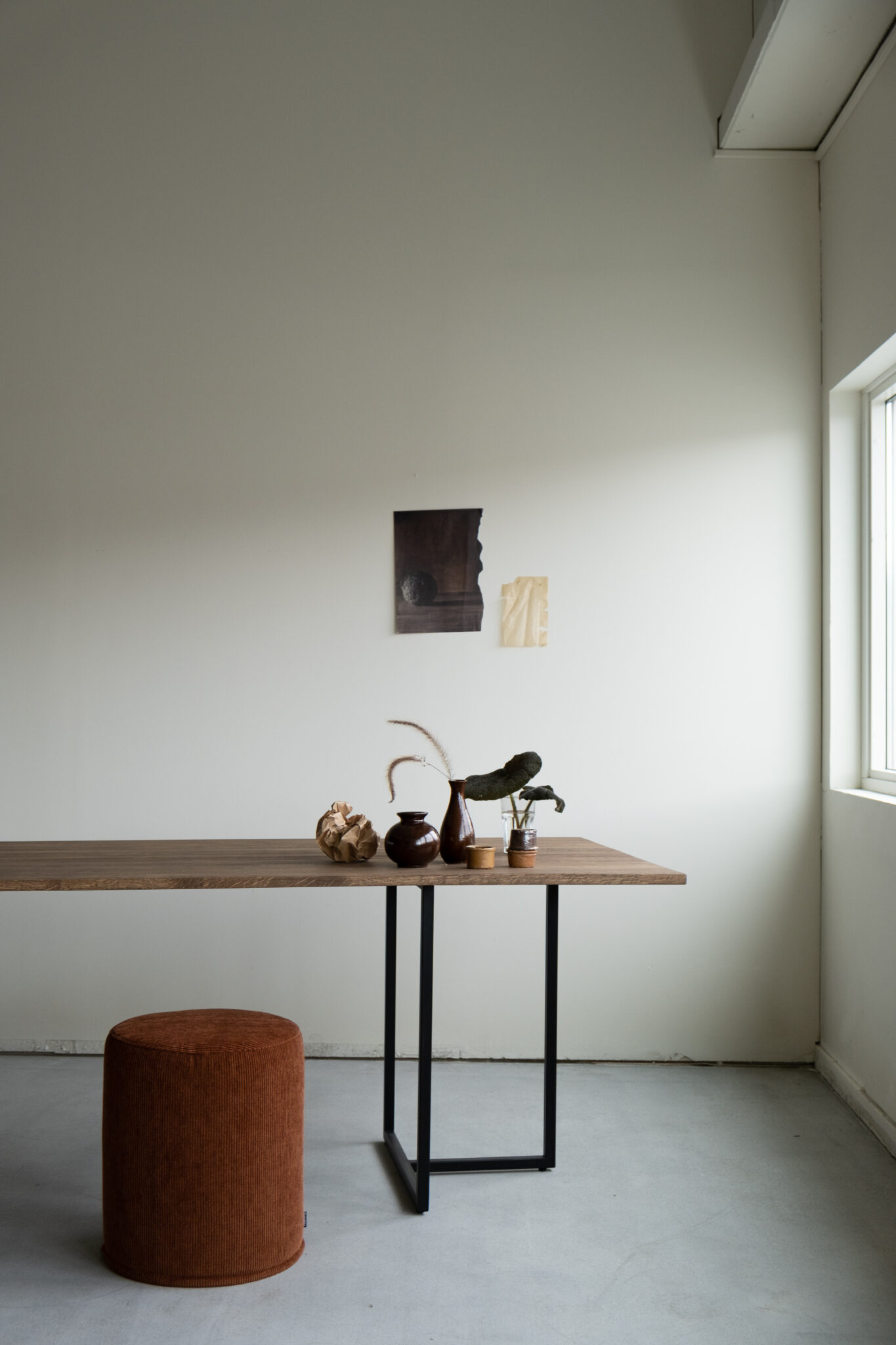 T-bordet fikk navnet sitt fra formen på bena, som bærer to avlange bordplater. Treplater i kombinasjon med de svarte, lette metallbena skaper en fascinerende materiell kontrast. Utseendet er grafisk og industrielt, men fortsatt varmt.