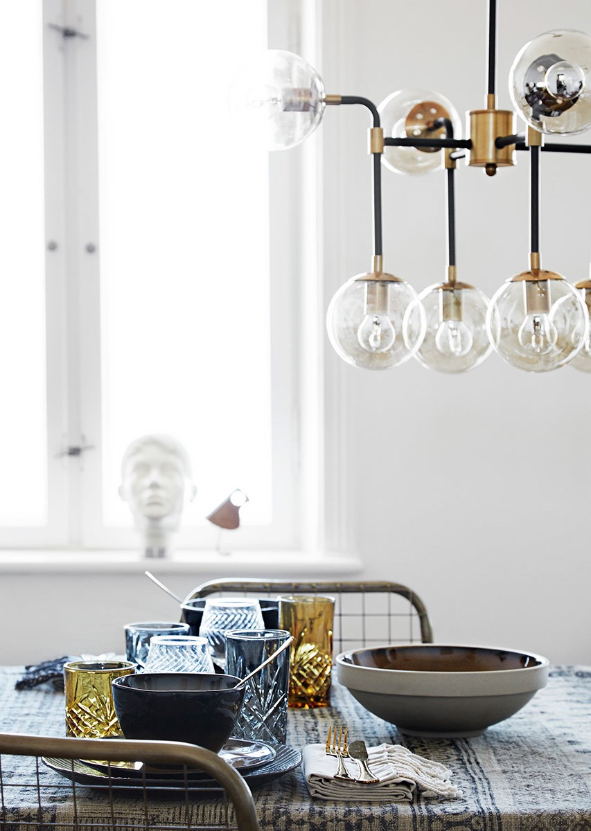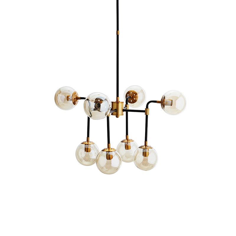 Lampen kommer i matt sort finish og messing detaljer, har åtte armer med glasskuler.
