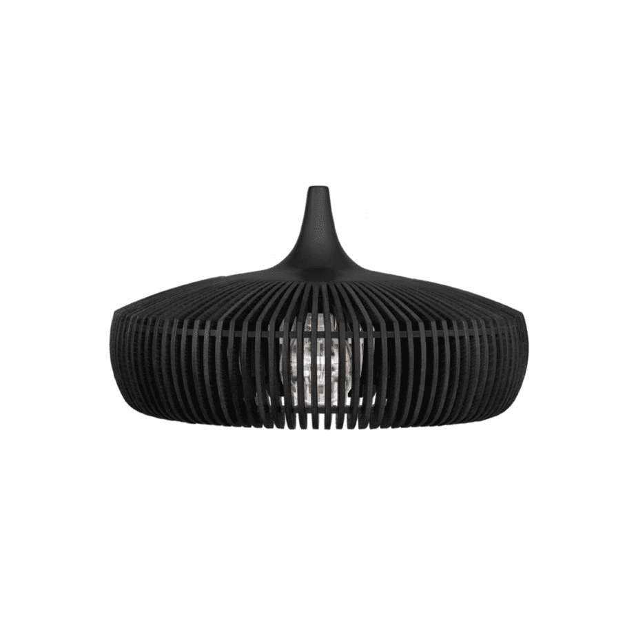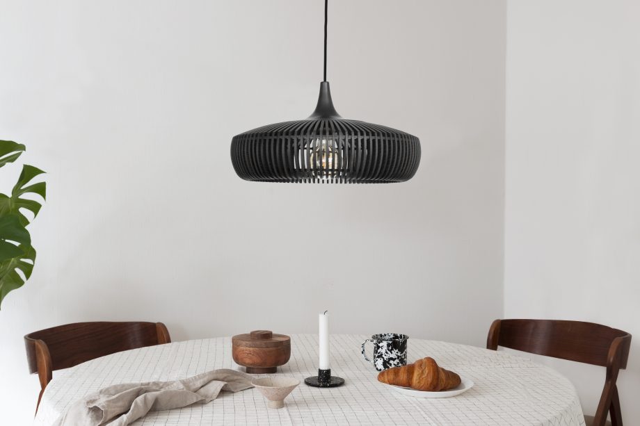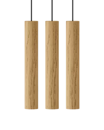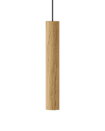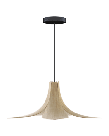 Taklampen Clava Dine Wood, håndlaget lampe av laserskåret ask og finér av eik med en solid eikertopp.
