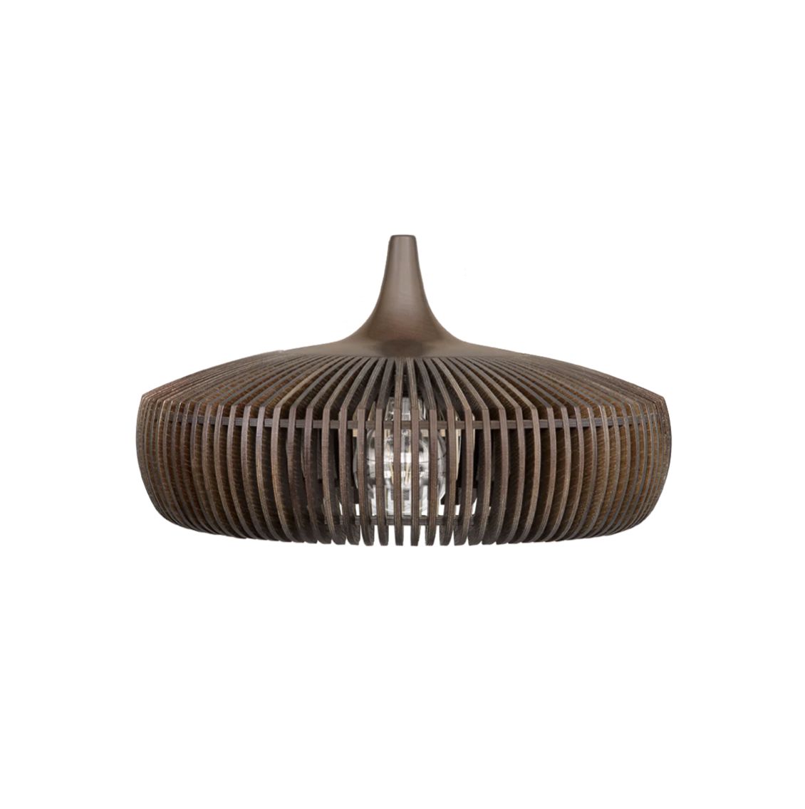 Taklampen Clava Dine Wood, håndlaget lampe av laserskåret ask og finér av eik med en solid eikertopp.