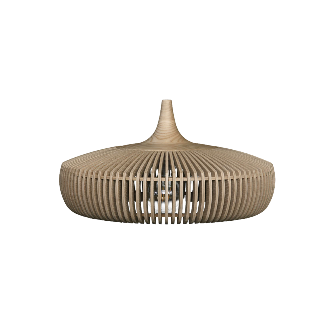 Taklampen Clava Dine Wood, håndlaget lampe av laserskåret ask og finér av eik med en solid eikertopp.