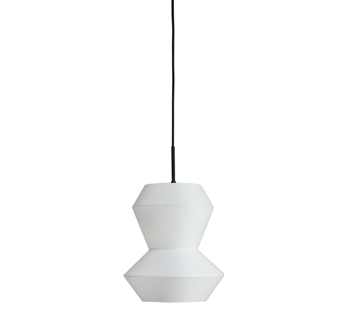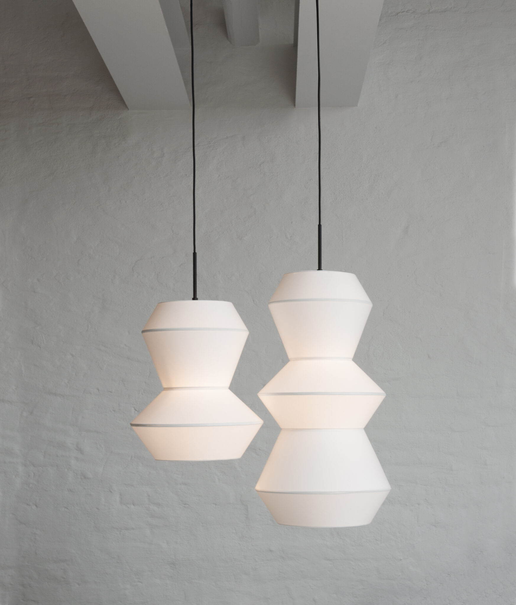 Lampen er laget av semi-transparent, matt stoff for å oppnå et atmosfærisk lys, som danner grafiske kontraster mellom det hvite og det sorte.