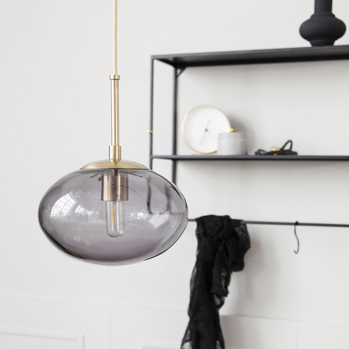 Med hjelp av belysning kan du skape en koselig atmosfære i hjemmet og samtidig få en vakker dekorasjon. Denne vakre pendellampen heter Opal og er en kombinasjon av en grå røykfarget glass-skjerm og en messingfarget metallpendel. Bruk den over spisebordet, kokeøya på kjøkkenet eller som et koselig lys i stuen.