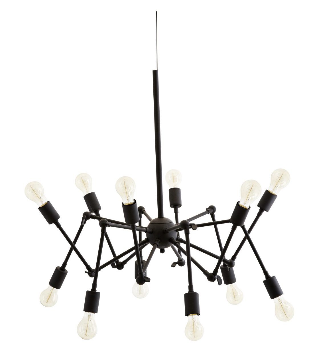 «Spider» er en helt rå taklampe med industriell look! Lampen kommer i matt sort finish og har tolv armer som strekker seg opp og ned om hverandre for best mulig belysning.