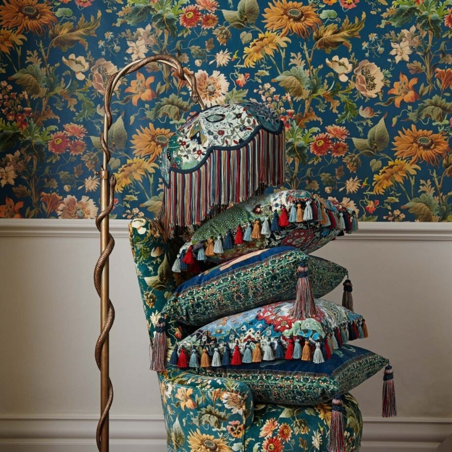 I den Arthurianske mytologien var øya Avalon et jordisk paradis, et sted der frukten ble snørt med magi og blomstene blomstret i overnaturlig skjønnhet. Så følger det at AVALON-tapetet blomstrer med utsøkte solsikker, valmuer, tusenfryd og liljer. Håndtegnet i blyant og akvarell på et ‘Noir’ bakteppe, og legemliggjør dette mystiske arkivet.