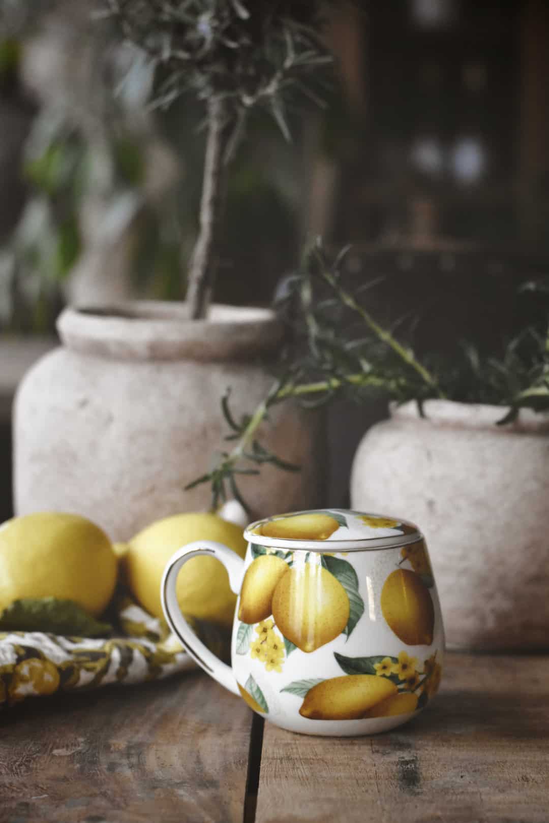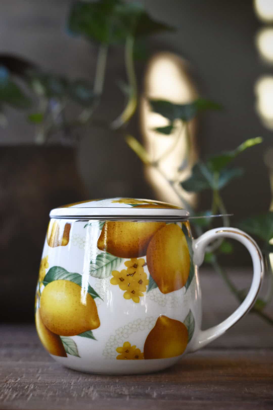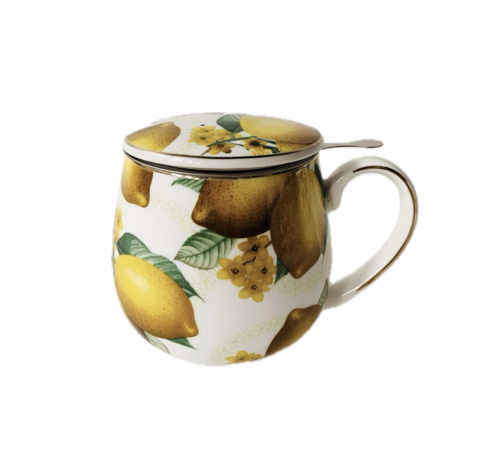 Dekorativ tekopp dekorert med sitroner, har lokk og integrert tesil,  tåler oppvaskemarskin.