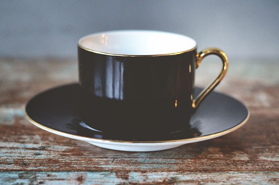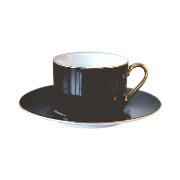 Lekker tekopp med skål i blank sort, med «gullkant».