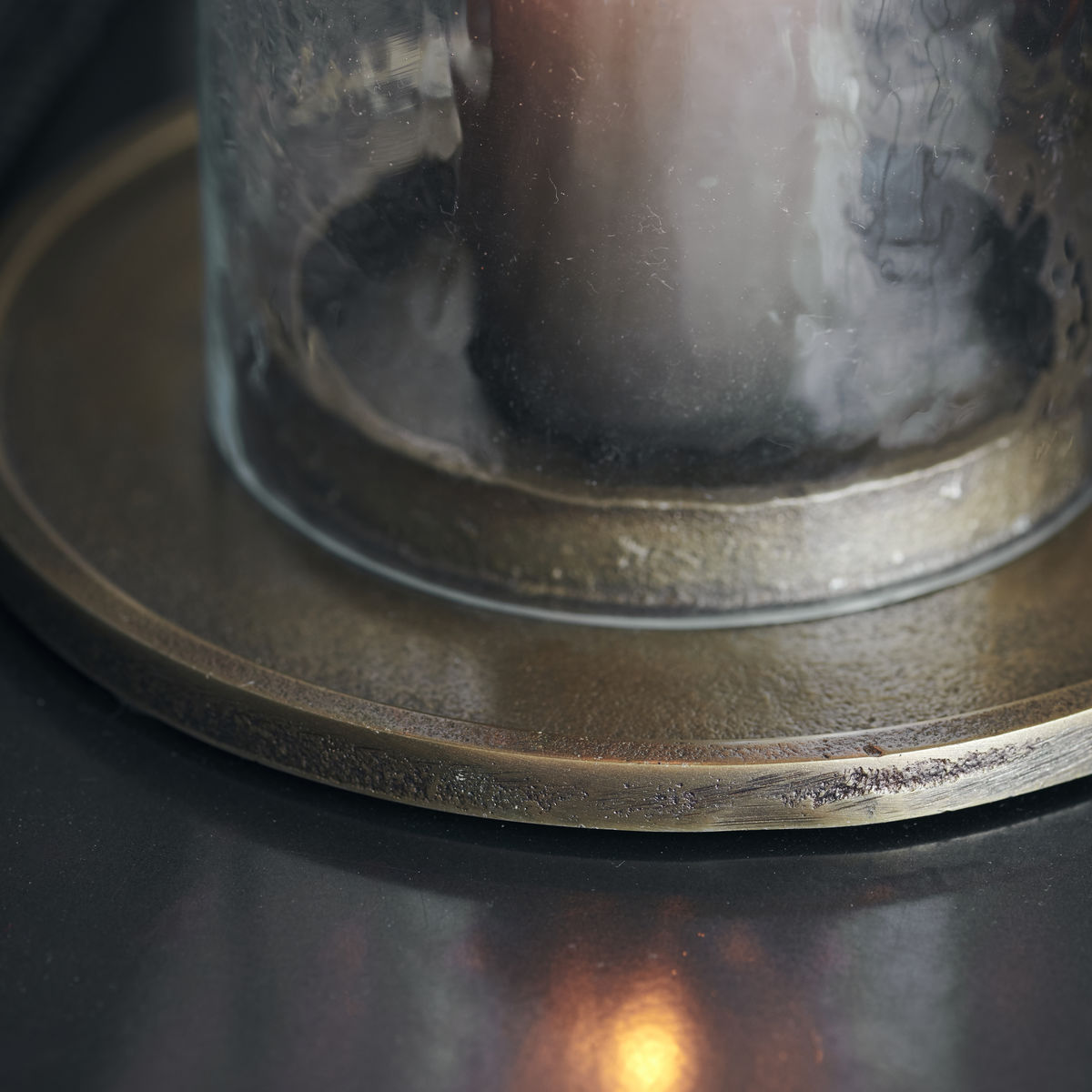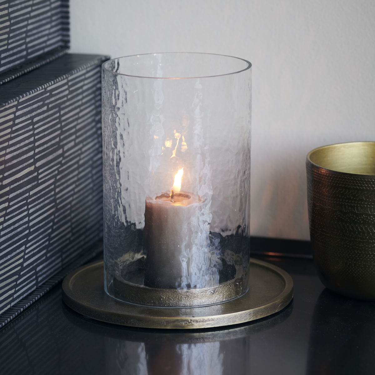 Tilfør en følelse av varme, og lys opp høstkveldene. Lysestaken kommer i en enkel form, men likevel med fine detaljer. Sokkelen er laget av aluminium med messingfinish som gir et nydelig gyldent preg. Glasset har en fin, noe bølgete struktur som gir en fin og feminin touch som bare forbedres når du setter i et stearinlys. Plasser den på trappene, spisebordet eller hvor enn du trenger å skape en koselig atmosfære.
