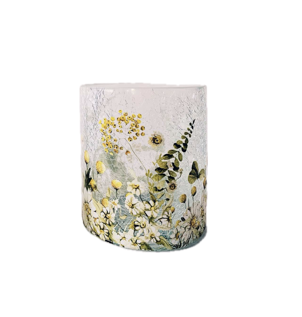 Dekorativ telysholder i klart, krakelert glass med sommerlig motiv