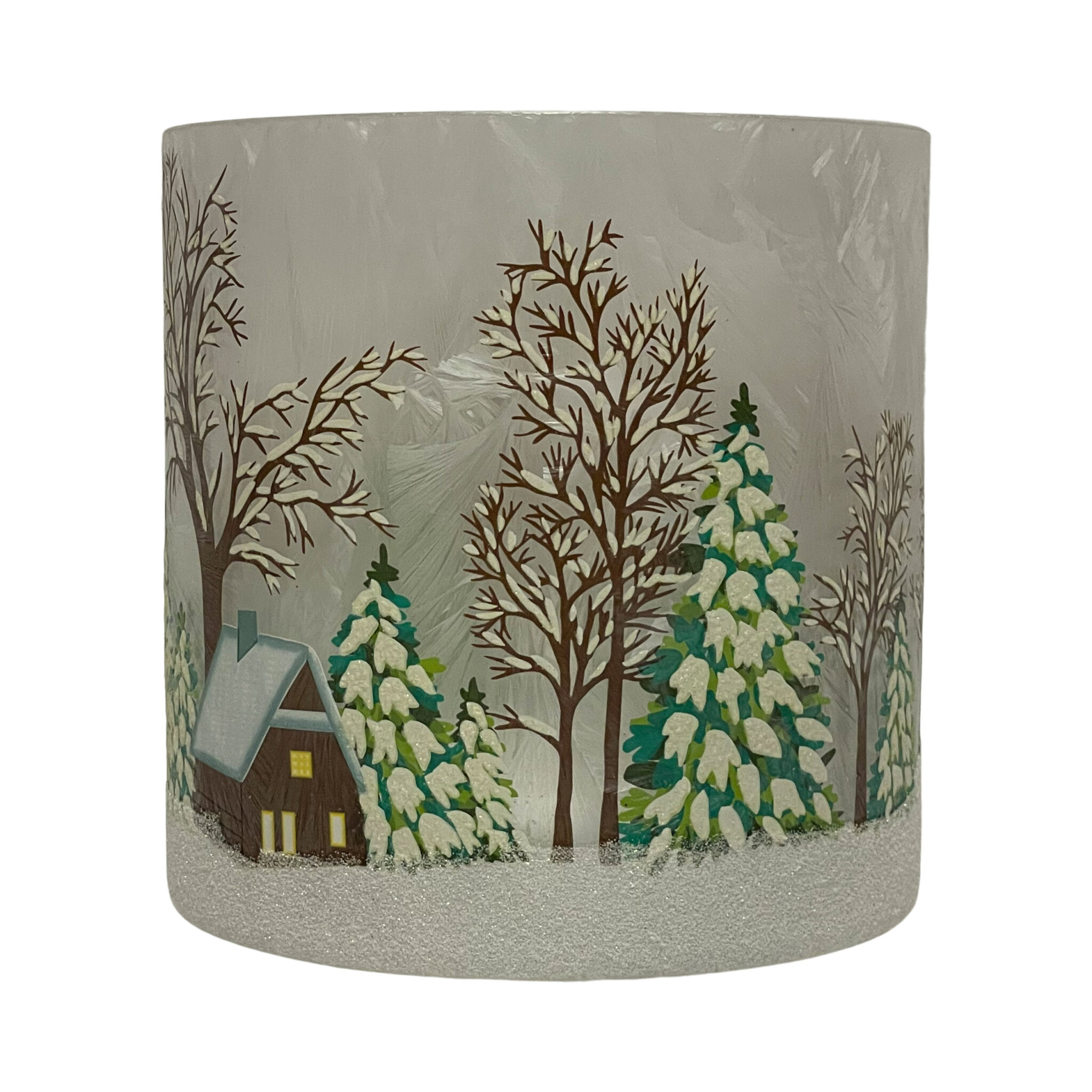Dekorativ telysholder i klart, krakelert glass med vintermotiv.