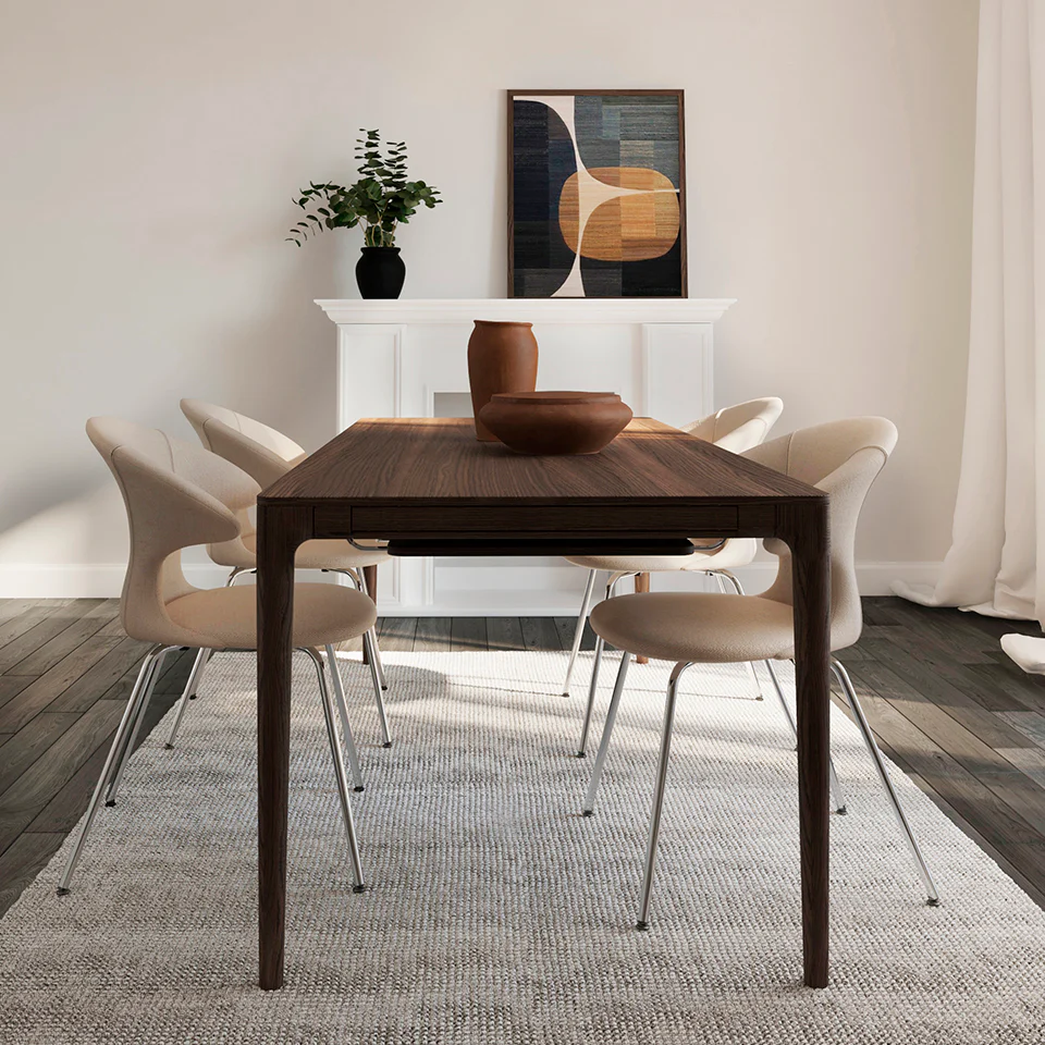 Heart’n’Soul spisebordet er der form møter funksjon. Det uttrekkbare spisebordet har en slank harmonisk silhuett som gir det et luftig utseende i spisestuen. Det uttrekkbare spisebordet har to stoffinnlagte skuffer i hver ende av bordet, hvor du raskt kan legge vekk saker og ting.