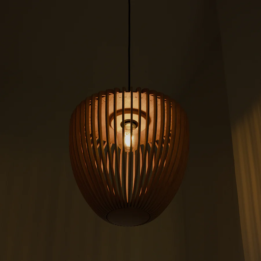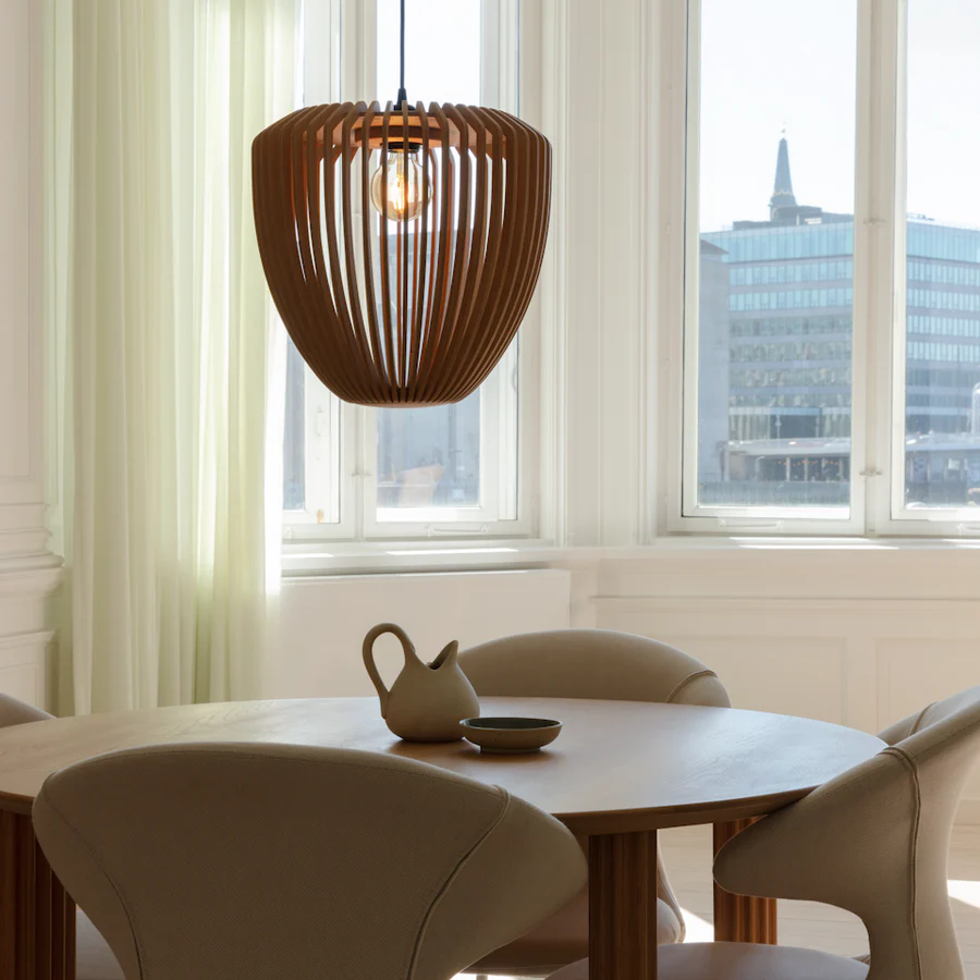 Clava Wood er laget av laserkuttede trelameller, og skaper vakre lysstråler på veggene i det omkringliggende rommet. Tredetaljene gir et sofistikert preg av natur til designet og hjemmet ditt, mens den organiske formen vil få lampen til å fremstå som et skulpturelt stykke.