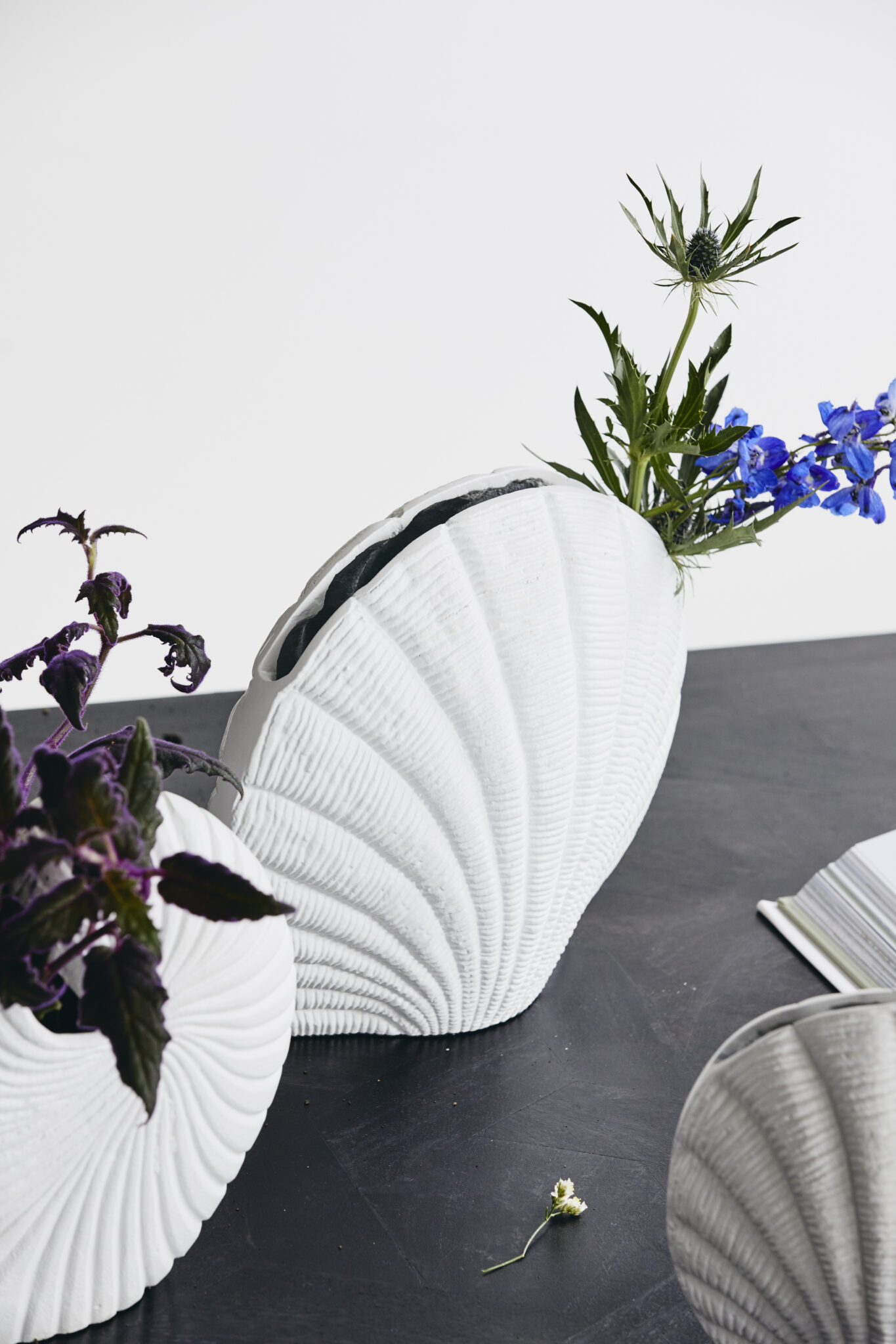 Vase formet som et skjell i metall i hvit finish. Bruk den til noen få blomster eller tørkede blomster eller bare som en dekorativ skulptur. Belagt med lakk inni for vannavstøtende.