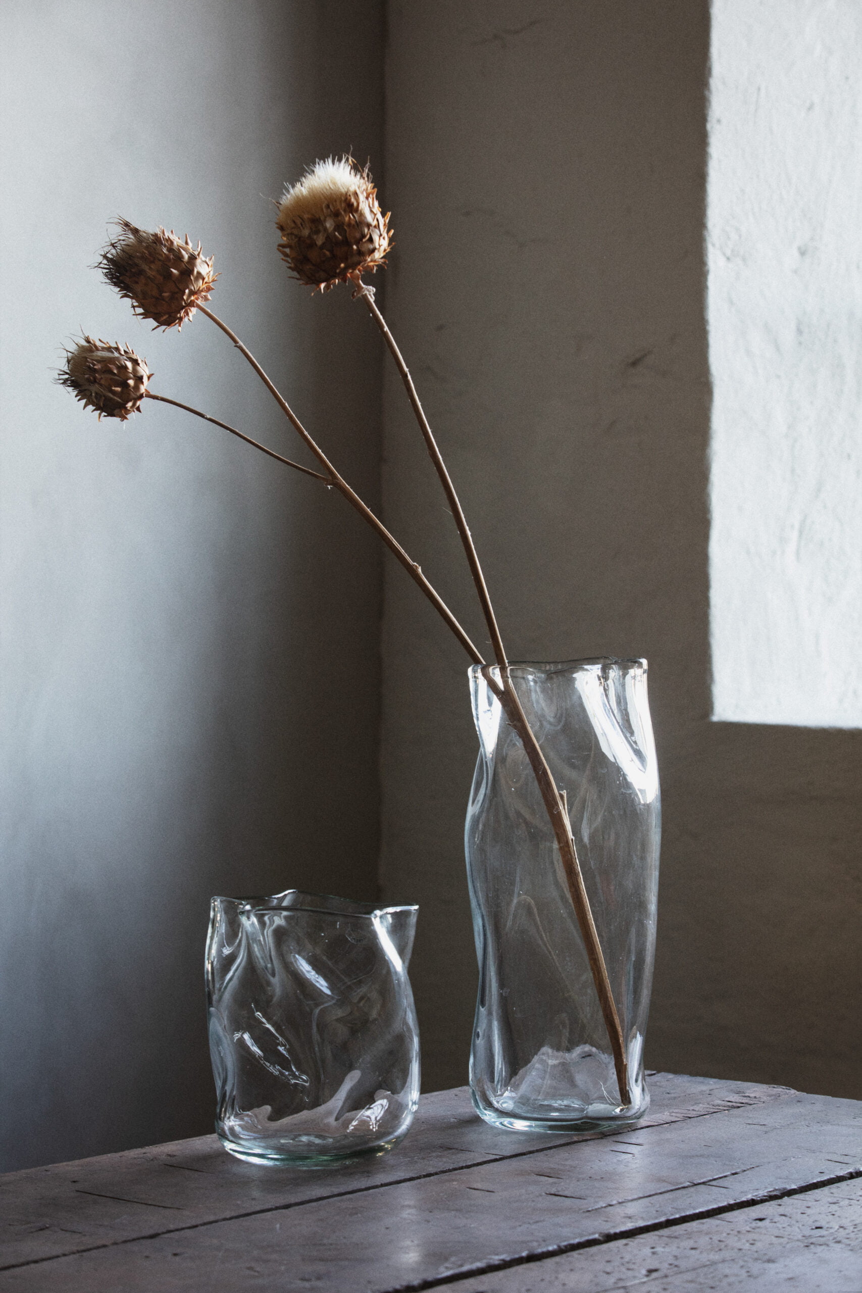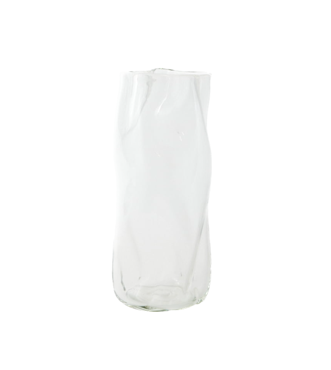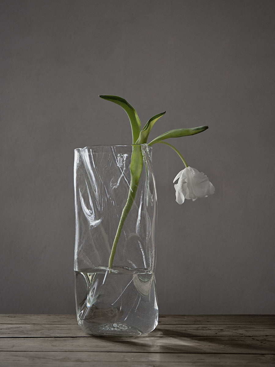 Vasen har et organisk design og hver gjenstand er unik. Glasset er hamret med struktur for å få en organisk og unik form.