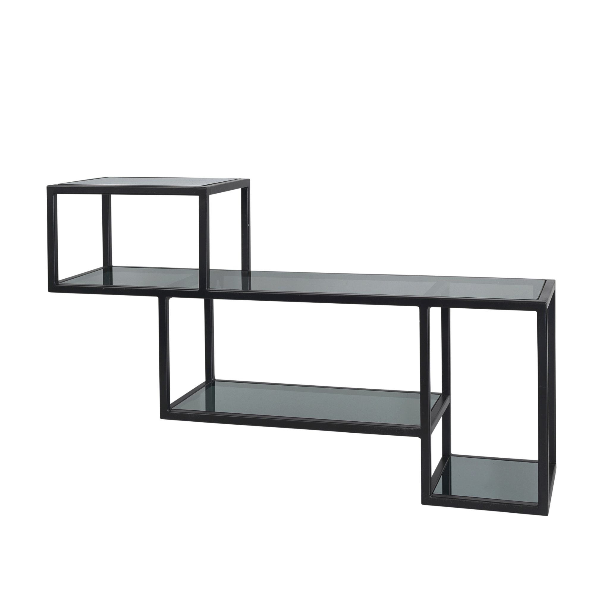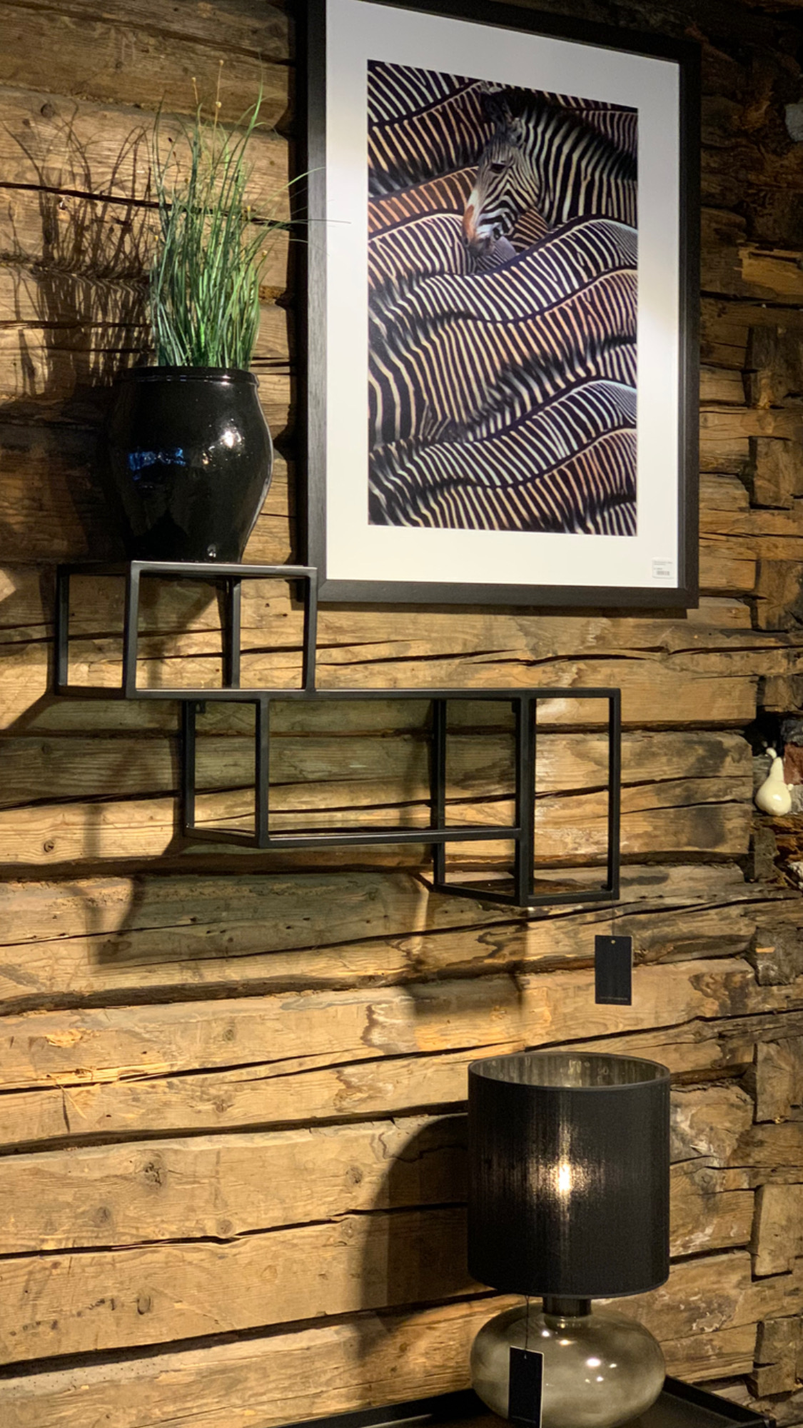 Industrielt og stilrent vegghylle i sort metall og sotet glass.