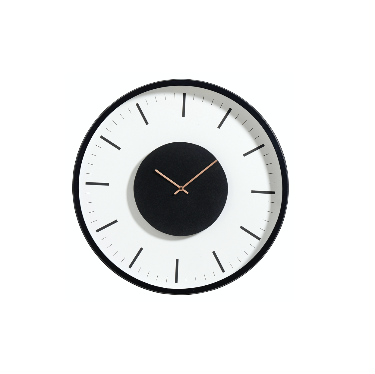Dekorativ klokke til vegg inspirert av klokkene på en jernbanestasjon. Laget i metall med svart gulvlakk, hvit urskive og en forgyllet klokkeviser.