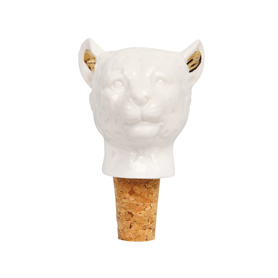 Vinkork i porselen og kork, formet som en leopard med gull ører.