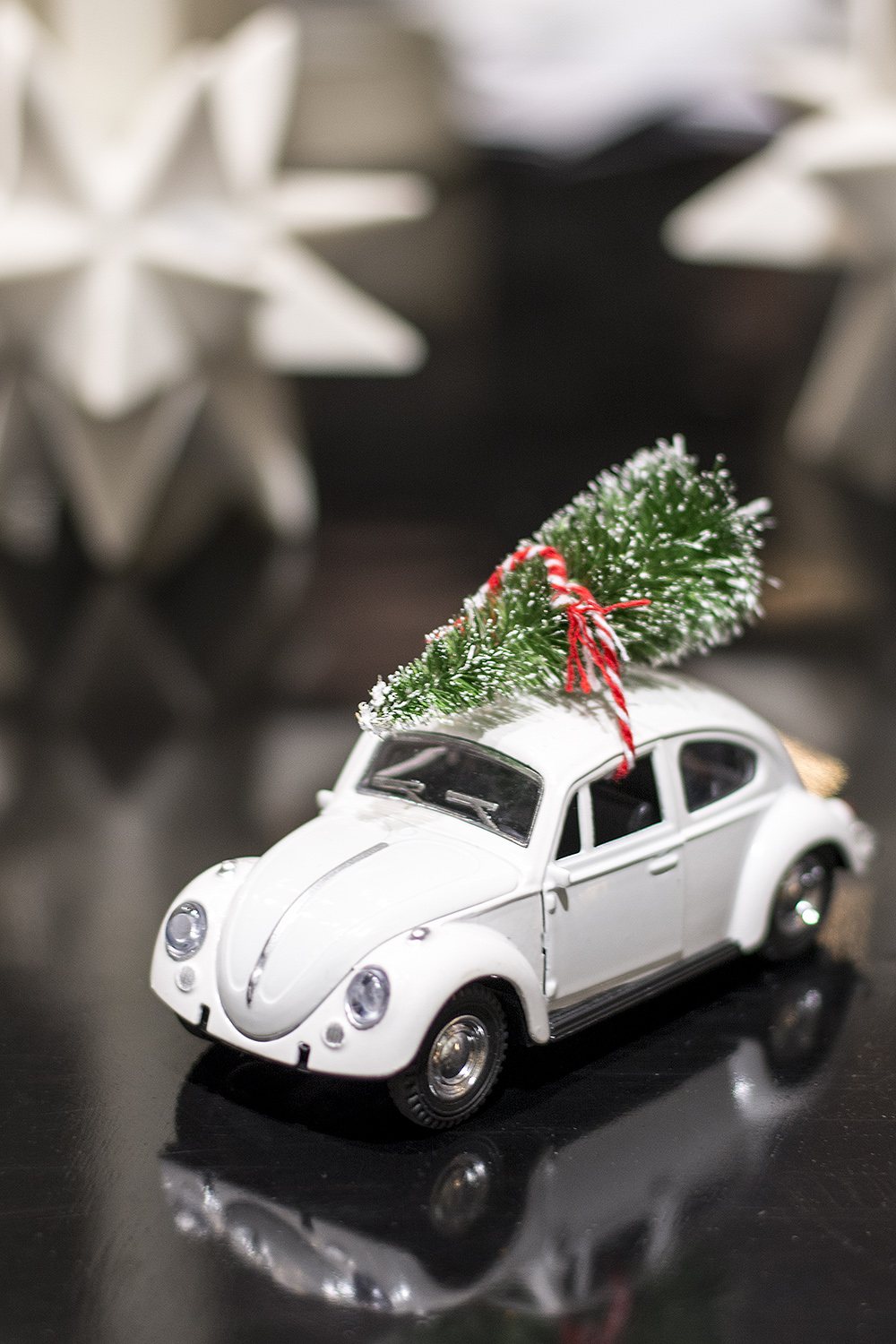 Vintage folkevogn med juletre på taket. Dekorativ og en av våre favoritter! Kan til og med trekkes opp, så en morsom leke for ungene!