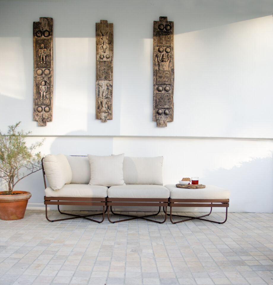 Med en blanding av stramme linjer og myke kurver har Bris et tidløst design. Konstruksjonen er laget av solid pulverlakkert rustfritt stål, men det er visuelt lett. De komfortable putene i slitesterke stoffer tåler elementene så vel som rengjøring