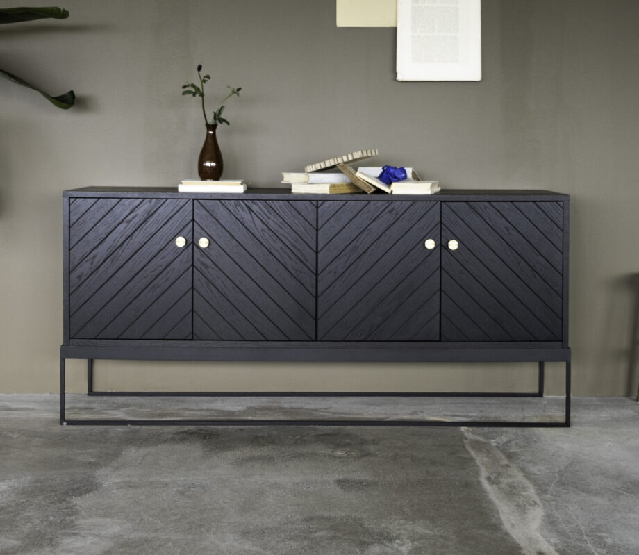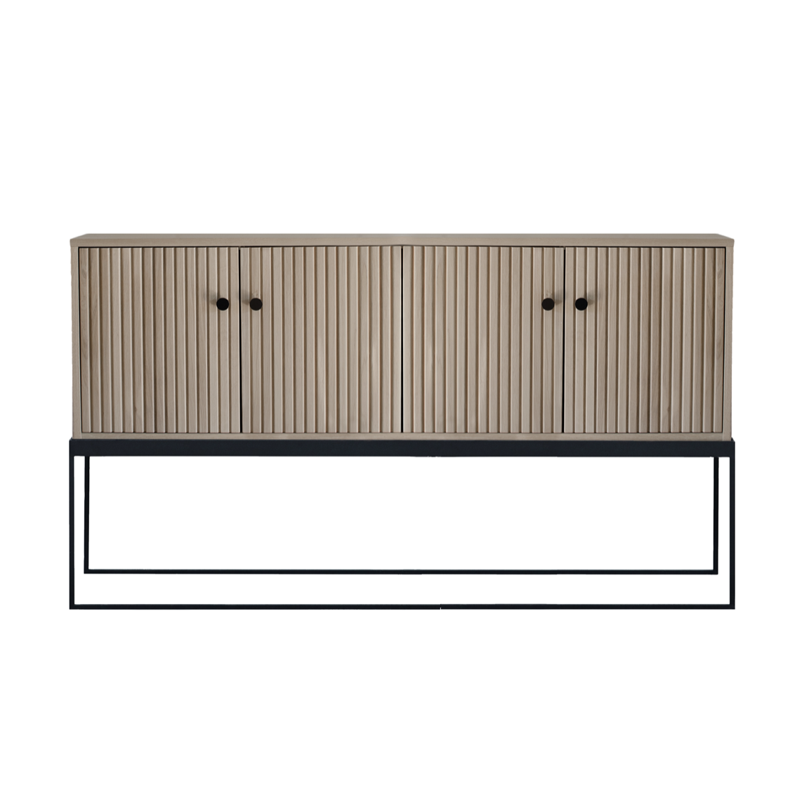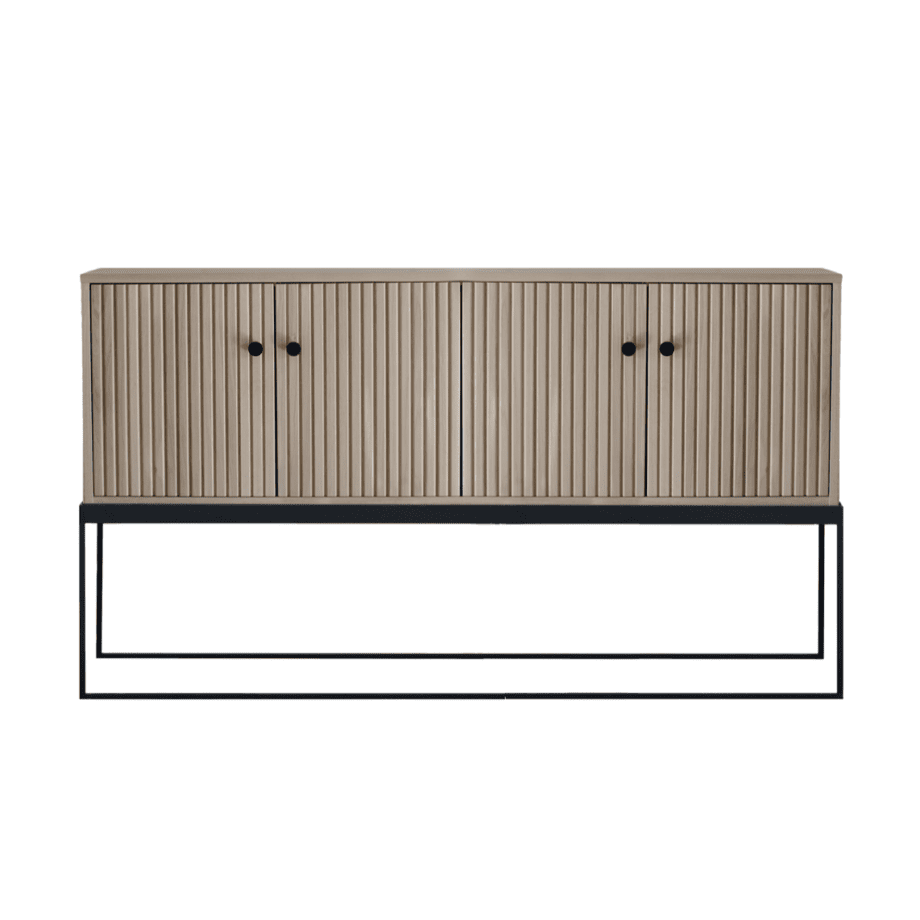 Dis skjenk 160 er kombinasjonen av overdimensjonert og minimalistisk en sterk motsetning. Massivt håndverk og ærlige eikematerialer suppleres med en pulverlakkert stålramme. Velg mellom sortbeiset, hvitoljet eller smoked. Dører i fiskebenmønster, helt slette dører eller med riller. Håndtak i messing eller sortlakkert metall.