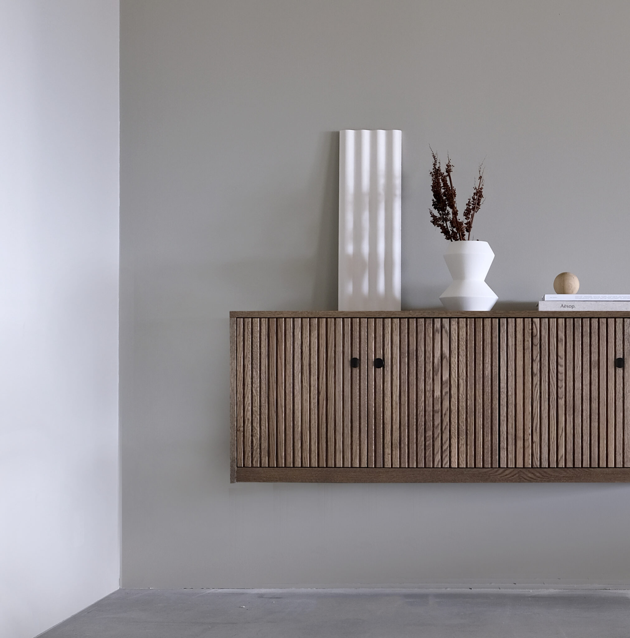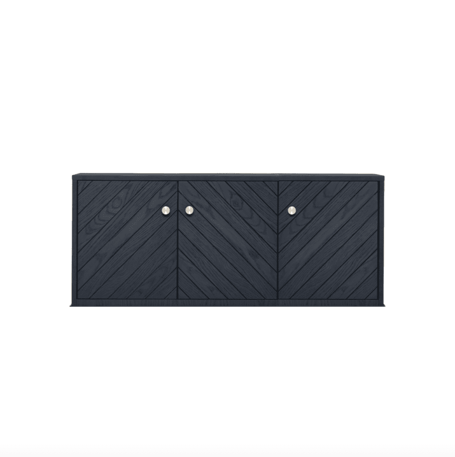 Dis skjenk til vegg ser flott ut, gjør plassen mer åpen og luftig. Kombinasjonen av overdimensjonert og minimalistisk, med massivt håndverk og ærlige eikematerialer. Velg mellom sortbeiset, hvitoljet eller smoked. Dører i fiskebenmønster, helt slette dører eller med riller.