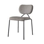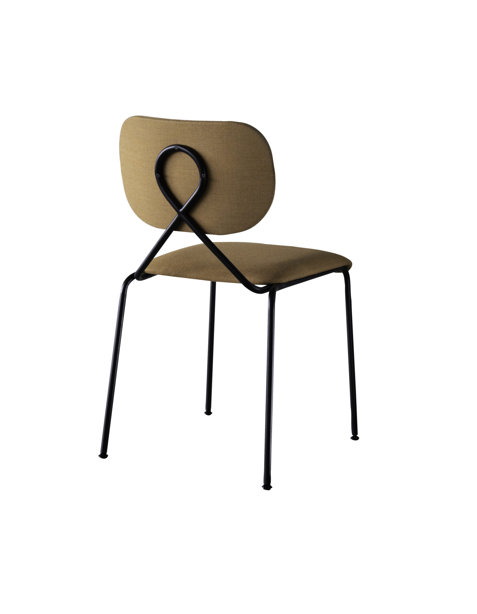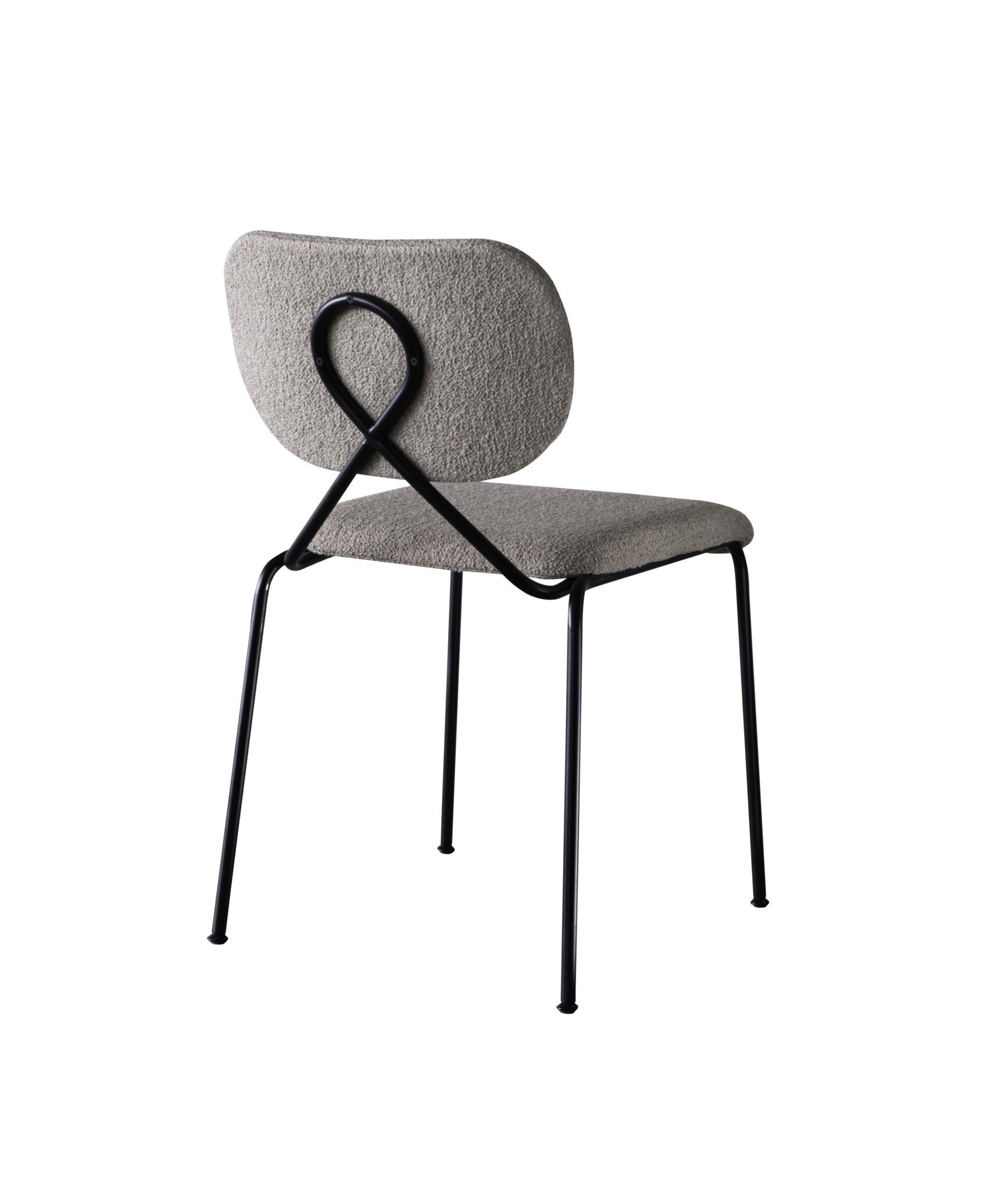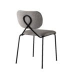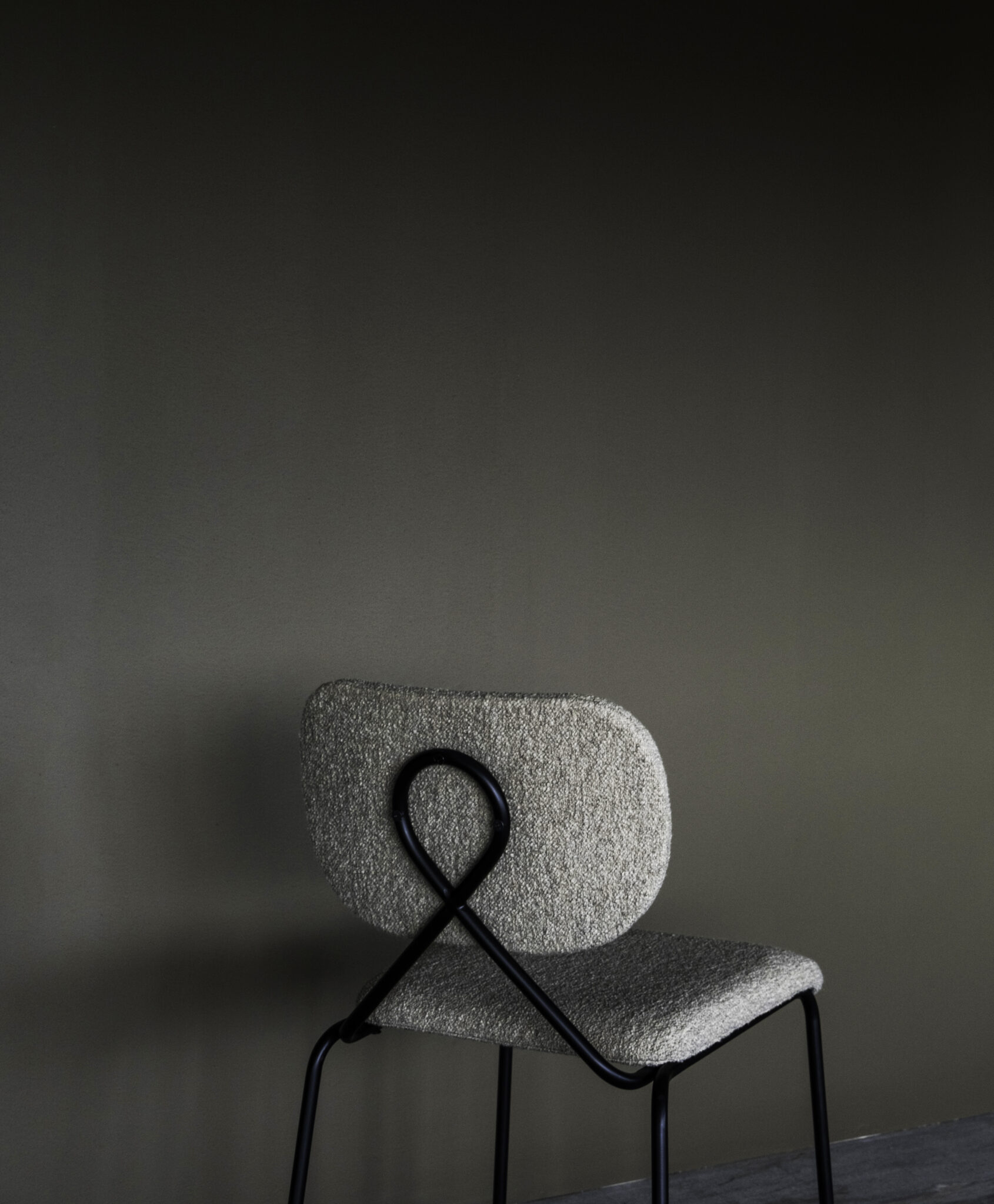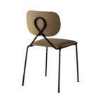 Den iøynefallende vridde metallløkken på stolryggen var selve detaljen som satte i gang designerens tanker. Den støtter den buede, polstrede ryggen og gir en generøs åpning mellom rygg og sete, noe som understreker enkelheten og ryddigheten til stolen.